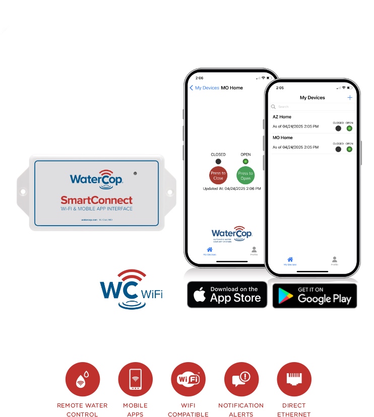SmartConnect works with WaterCop Classic, Pro, and Leak Stop+ systems to provide real-time alerts to your smart phone or tablet. Instantly receive notification of your WaterCop system’s valve position changes and power or Internet outages. You can even control your WaterCop system when you’re away from your property. Just download the WaterCop app and connect.